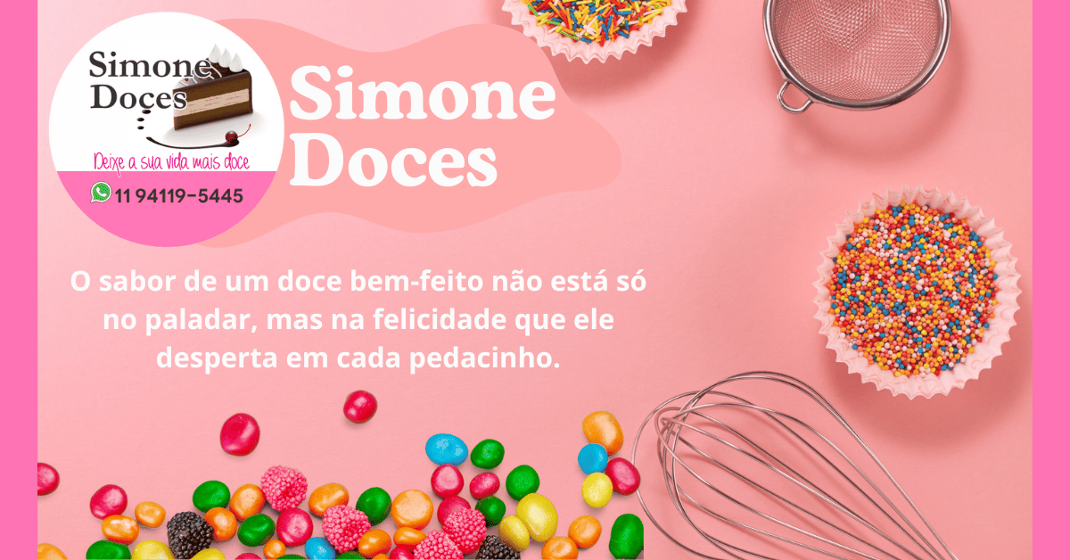 A Simone Doces nasceu em tempos desafiadores, transformando uma cozinha em um ateliê de sabores. O objetivo é adoçar vidas com bolos e doces que carregam uma história de superação. Atualmente, a empresa retoma suas atividades com a intenção de tornar momentos especiais mais doces e memoráveis, com ênfase na conexão emocional com os produtos. O sabor de um doce bem-feito não está só no paladar, mas na felicidade que ele desperta em cada pedacinho. Encomende bolos temáticos e deliciosas tortas para todas as ocasiões.